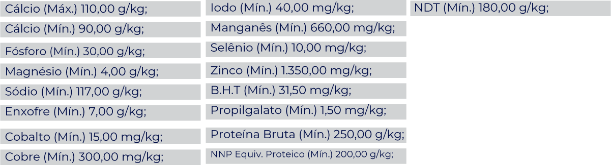 Farelo de Glúten de Milho 21, Milho Moído, Ureia Pecuária, Cloreto de Sódio, Fosfato Bicalcico, Calcário Calcitico, Caulim, Enxofre Ventilado (Flor de Enxofre), Óxido de Magnésio, Sulfato de Zinco, Sulfato de Cobalto, Sulfato de Cobre, Iodato de Cálcio, Monóxido de Manganês, Selenito de Sódio e Aditivo Antioxidante (B.H.T e Propilgalato), Veículo QSP e Aromatizante.