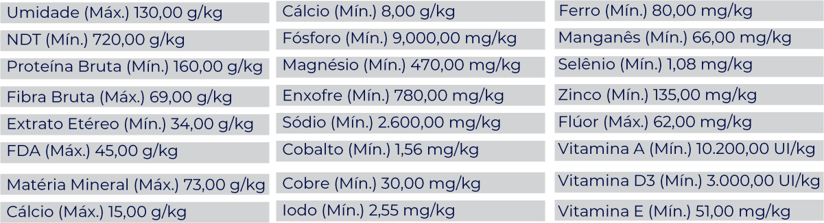 Milho Moído, Farelo de Glúten de Milho, Farelo de Trigo, Farelo de Soja, Calcário Calcítico, Fosfato Bicálcico, Cloreto de Sódio, Caulim, Enxofre Ventilado (Flor de Enxofre), Óxido de Magnésio, Sulfato de Zinco, Sulfato de Cobalto, Sulfato de Cobre, Iodato de Cálcio, Monóxido de Manganês, Selenito de Sódio, Caulim, Vitamina A, Vitamina D3, Vitamina E, Aditivo Antioxidante (B.H.T e Propilgalato), Veiculo QSP e Aromatizante.
