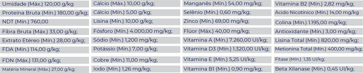 Milho Moído, Farelo de Soja, Calcário Calcítico, Fosfato Bicálcico, Cloreto de Sódio, DL Metionina, Sulfato de Zinco, Sulfato de Ferro, Sulfato de Manganês, Sulfato de Cobre Penta hidratado, Sulfato de Cobalto, Selenito de Sódio, Iodato de Cálcio, Acetato de Retinol, Colecalciferol, Menadiona Bissulfito Nicotinamida, Acetato de D-Alfa Tocoferol, Mononitrato de Tiamina, iboflavina, Cloridrato de Piridoxina, Cianocobalamina, Biocolina, Ácido Nicotínico, Ácido Pantotênico, Ácido Fólico, Biotina, Endo-1,4- beta-xilanase (Trichoderma citrinoviride Bisset – IMI SD 135), 6-fitase