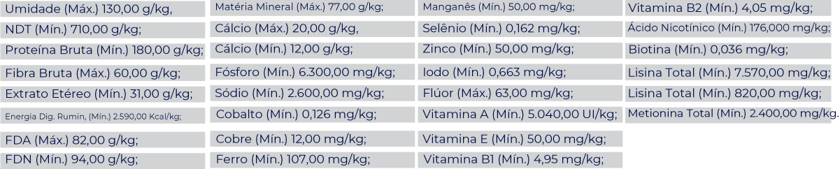 Milho Moído, Farelo de Trigo, Farelo de Glúten de Milho, Farelo de Soja, Calcário Calcítico, Fosfato Bicálcico, Cloreto de Sódio, Óxido de Magnésio, Caulim, Sulfato de Cobalto, Sulfato de Ferro, Sulfato de Cobre, Iodato de Cálcio, Monóxido de Manganês, Selenito de Sódio, Sulfato de Zinco, Vitamina A, Vitamina D, Vitamina E, Vitamina B1, Vitamina B2, Ácido Nicotínico, Biotina, Aditivo Antioxidante (B.H.T e Propilgalato) e Aromatizante.