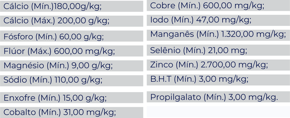 Fosfato Bicalcico, Cálcario Calcitico, Cloreto de Sódio (sal comum), Enxofre Ventilado (Flor de Enxofre), Óxido de Magnésio, Sulfato de Zinco, Sulfato de Cobalto, Sulfato de Cobre, Iodato de Cálcio, Monóxido de Manganês, Selenito de Sódio e Aditivo Antioxidante (B.H.T e Propilgalato) e Aromatizante.