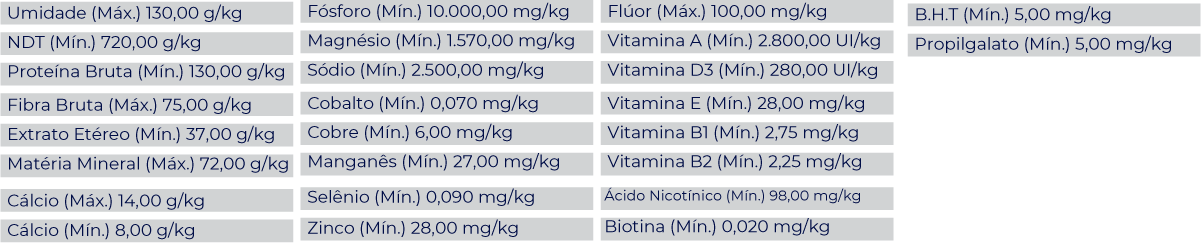 Milho Moído, Farelo de Trigo, Farelo de Glúten de Milho, Calcário Calcítico, Fosfato Bicálcico, Cloreto de Sódio, Óxido de Magnésio, Caulim, Sulfato de Cobalto, Sulfato de Ferro, Sulfato de Cobre, Iodato de Cálcio, Monóxido de Manganês, Selenito de Sódio, Sulfato de Zinco, Vitamina A, Vitamina D, Vitamina E, Vitamina B1, Vitamina B2, Ácido Nicotínico, Biotina, Aditivo Antioxidante (B.H.T e Propilgalato) e Aromatizante.