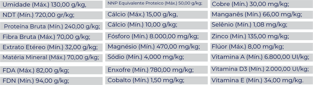 Milho Moído, Farelo de Soja, Calcário Calcítico, Fosfato Bicálcico, Cloreto de Sódio (NaCl – Sal Comum), Sulfato de Cobre, Sulfato de Zinco, Sulfato de Ferro, Sulfato de Manganês, Sulfato de Cobalto, Iodato de Cálcio, Selenito de Sódio, Vitamina A, Vitamina D3, Vitamina E, Vitamina K3, Vitamina B1, Vitamina B2, Vitamina B6, Vitamina B12, Ácido Nicotínico, Ácido Pantotênico, Ácido Fólico, Biotina, Biocolina, Propilgalato, BHT (Butihidroxitolueno), Endo-1,4- beta-xilanase (Trichoderma citrinoviride Bisset- IMI SD 135), 6-fitase (Komagataella Phaffii (Pichia Pastoris) –